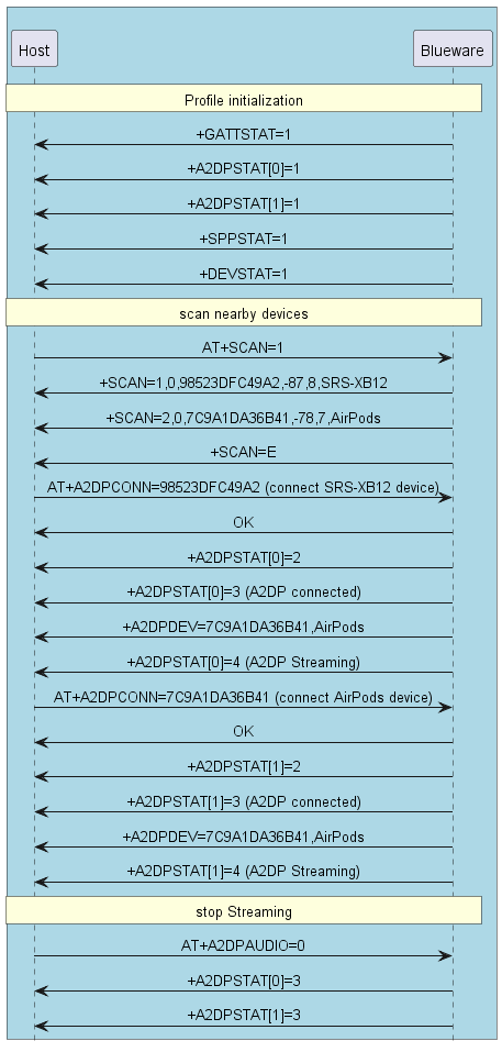 The transmission(source) mode connection needs to configure the module to A2DP Source, HFP Source, Only BT80X series and BT1035 support, 80X need to send AT+PROFILE configuration to source mode
