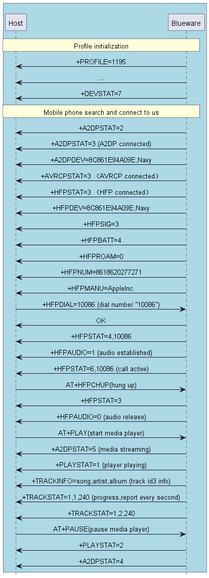If the factory firmware is an integrated transceiver program, the program default profile=339, Need to send AT+PRFOILE=1195 to configure audio receiving(sink) mode (Enable SPP, GATT Server, HFP Sink, A2DP Sink, AVRCP-Controller, PBAP). Some module transceiver programs do not support PBAP, such as BT955 module