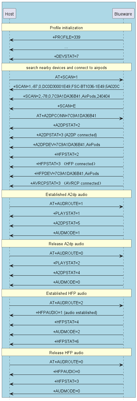 The transmission(source) mode connection needs to configure the module to A2DP Source, HFP Source, The program will not automatically enter the audio transmission mode or the call (intercom) mode after connecting the headset and speaker by default, you need to send the command: Start audio transmission (AT+AUDROUTE=1) Start HFP (AT+AUDROUTE=2)