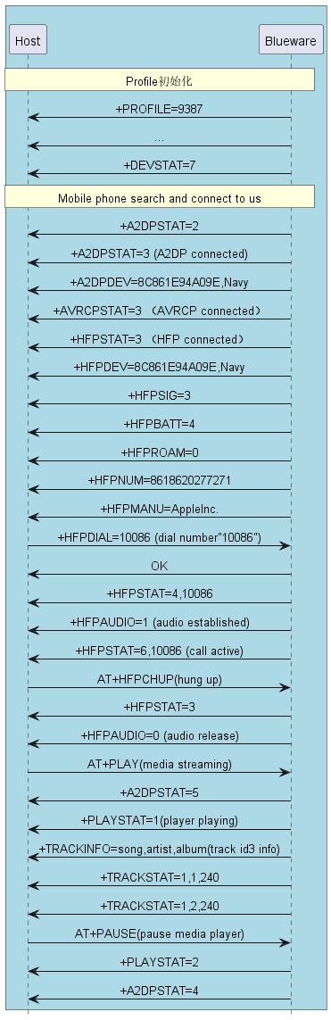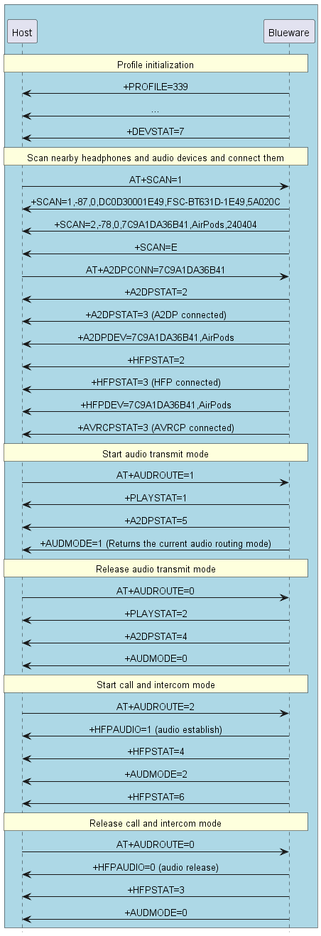 The transmission(source) mode connection needs to configure the module to A2DP Source, HFP Source By default, the program will not actively enter audio transmission mode or call (intercom) mode after connecting to headphones or speakers. You need to send instructions: Start audio transmission (AT+AUDROUTE=1) Start call (AT+AUDROUTE=2)