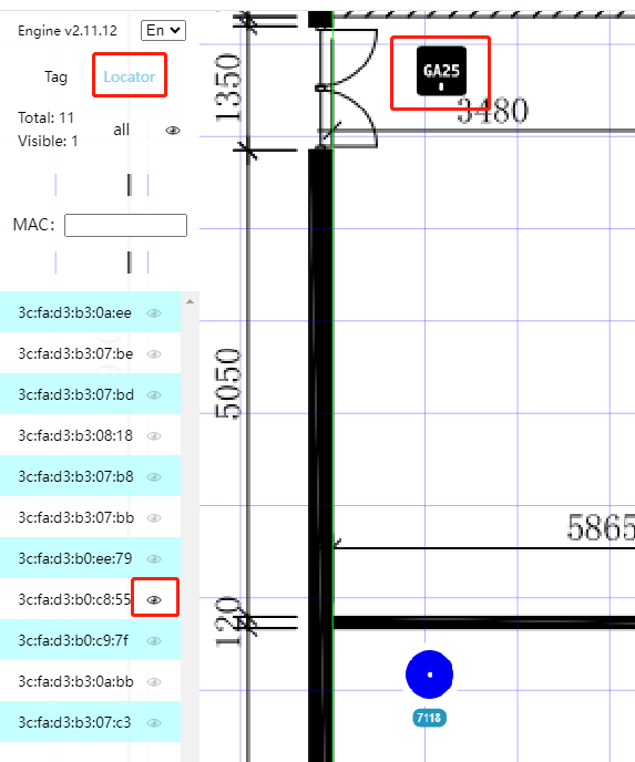 在 基站配置 - 部署 栏, 基站MAC 项写入实际地图位置中摆放基站的mac地址, 需跟实际地图中摆放的位置一致,不要写错了另一个位置的基站mac地址,会导致基站运行后,信标位置不准确 。