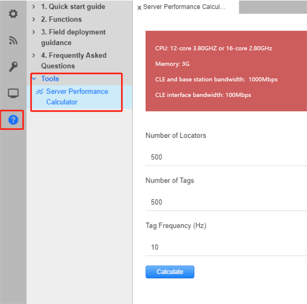 Enter the number of base stations, beacons, and the beacon frequency as shown below to calculate the corresponding server CPU configuration requirements.