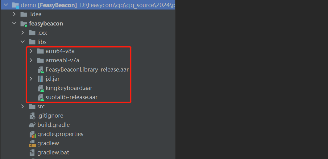 Place FeasyBeaconLibrary-release.aar, suotalib-release.aar, and so libraries in the project’s libs directory