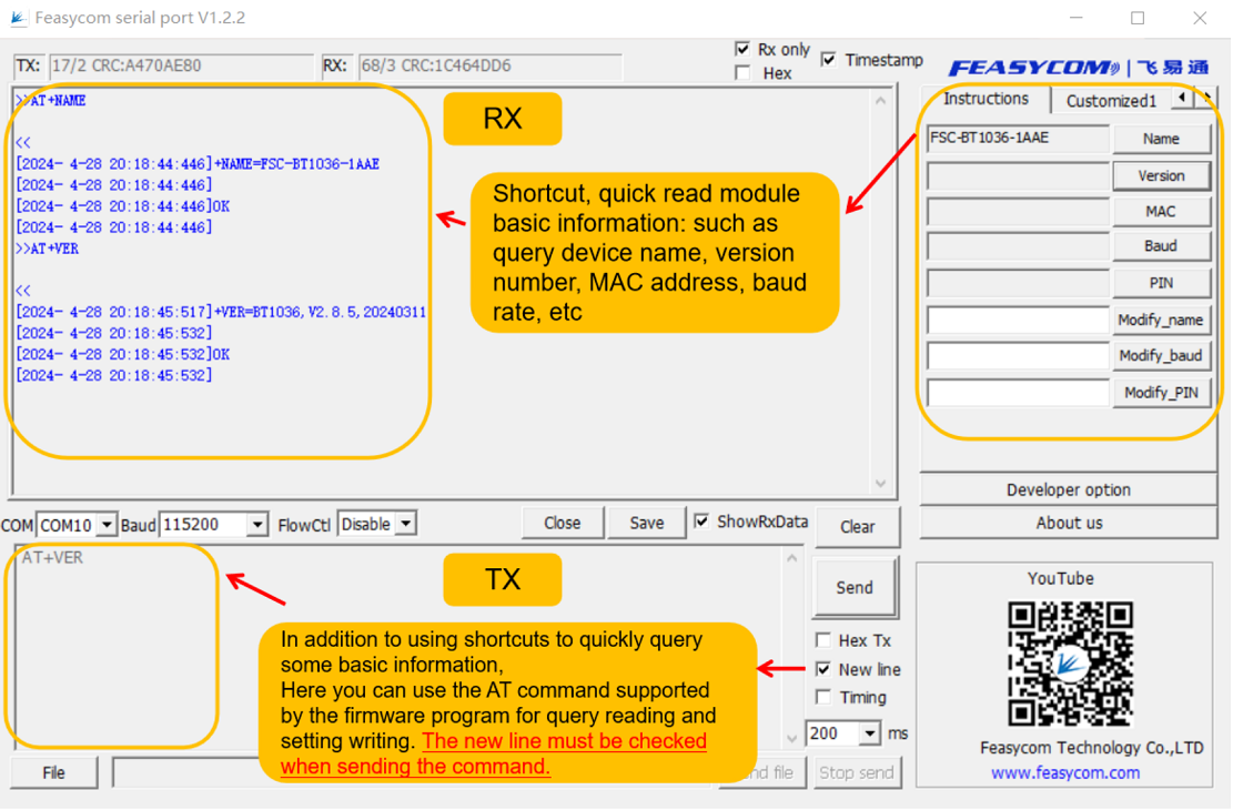 FeasyBlue already supports air command mode, which supports the use of AT commands to read and configure some parameters of the module.