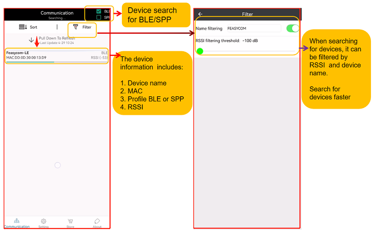 Tips: You can specify the device name through the “ Filter “ function, or set the Rssi value to quickly find the device.