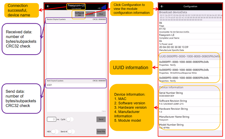 This document describes how to quickly use FeasyBlue App and Feasycom Serial Port Assistant. Supports SPP & BLE communication with the module via Bluetooth, which can scan, connect, send and receive data, read/write module parameters、OTA upgrade, OTA AT commands, read firmware version and other functions.