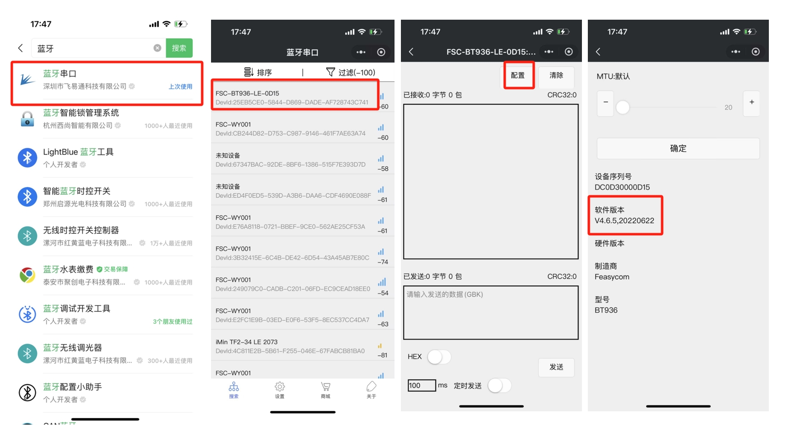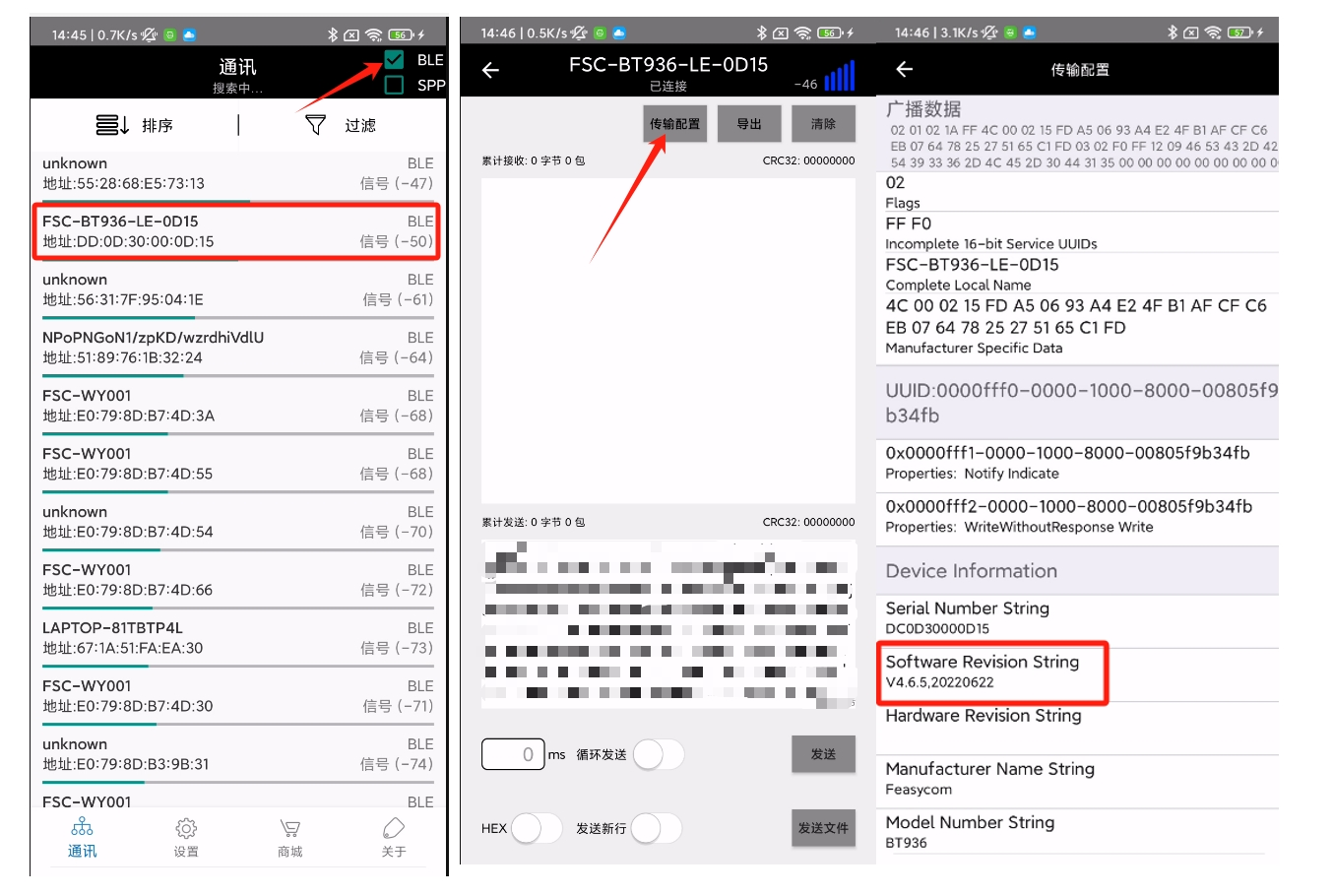 通过手机应用 FeasyBlue 与 FSC-BT936B系列模块 建立BLE连接后,在 传输配置 功能界面查看固件版本信息。
