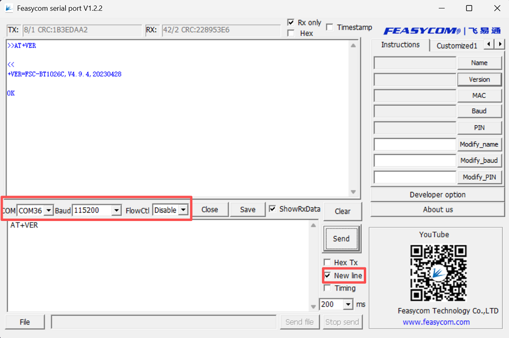 Run the Feasycom Serial Port Tool on the PC, set the correct COM and Baud, and check the New Line.