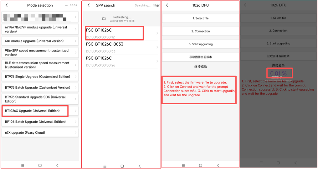 2.Search for and find the name of the Bluetooth module that needs upgrading (e.g., FSC-BT1026C). Selecting the device will automatically initiate Bluetooth pairing and connection. If Disconnect is displayed in the top-right corner of the screen, it indicates that the device is fully connected. If Connect is displayed, it means the device is not fully connected; please click Connect in the top-right corner to ensure a complete connection.