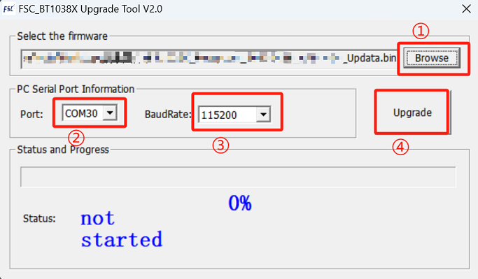 3.Open FSC-BT1038x Upgrade Tool. Click Browse to select the firmware upgrade file stored locally on the PC to load the firmware file.
