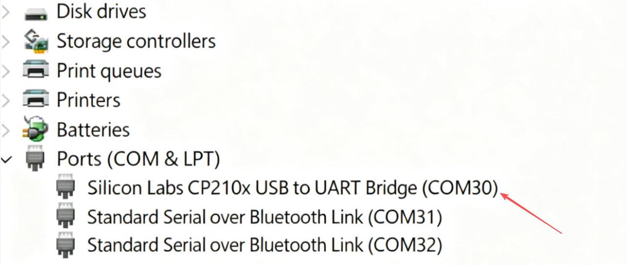 1.Connect FSC-DB200-BT1036C to PC via USB To Type-C cable, switch the UART/USB toggle to UART,Press the USB/battery power option button to switch to USB power supply, and the PC will automatically recognize the serial port and generate a virtual COMx port.