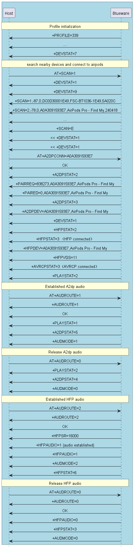 The default profile for FSC-BT1036C is 339, which enables both the classic Bluetooth audio transmission function and SPP, GATT_Server.