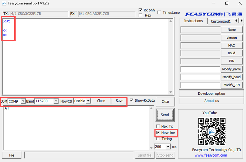 2.Run the Feasycom Serial Port Tool on the PC, set the correct COM and Baud, and check the New Line.