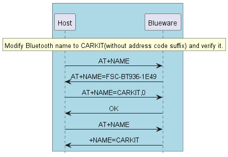 Before the MCU modifies any parameters, it is recommended to first query, then modify, and finally verify. For the MCU to modify the device name to CARKIT, the reference code example is as follows: