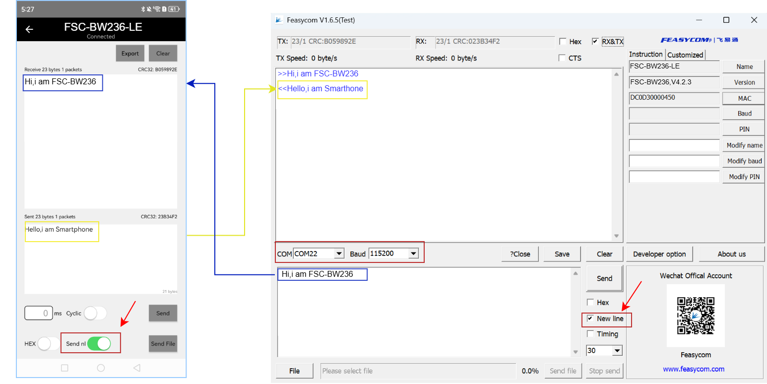 Enter the Throughput Mode: Before establishing Bluetooth or Wi-Fi connection, the FSC-BW236 module can use the command AT+TPMODE=1 to activate the transparent transmission mode.