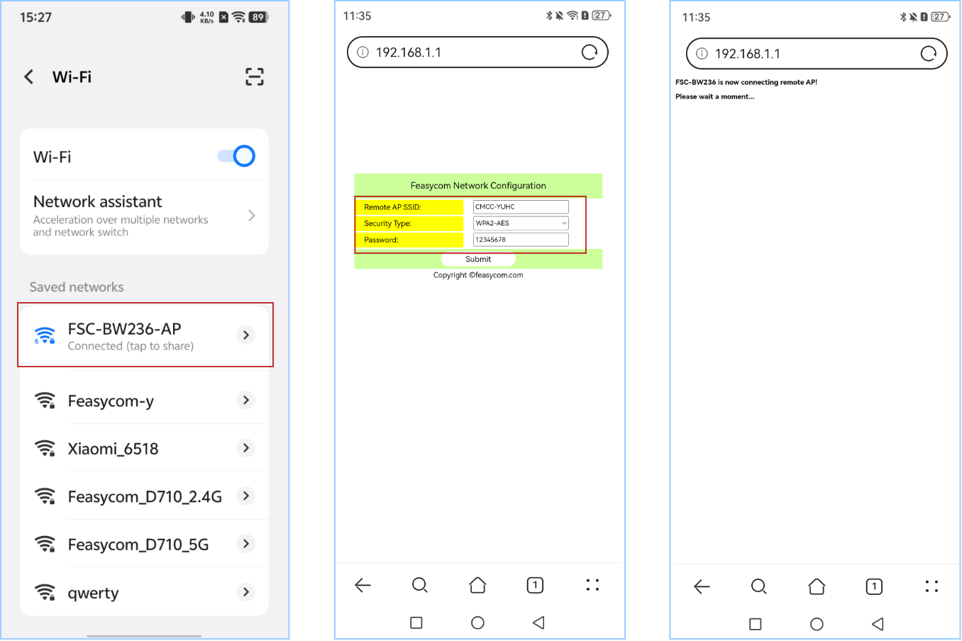 1.FSC-BW236 module acts as an AP. Mobile phones can connect to the module’s AP via Wi-Fi. For the FSC-BW236 general firmware, default the AP name is “FSC-BW236-AP” and the password is 12345678.