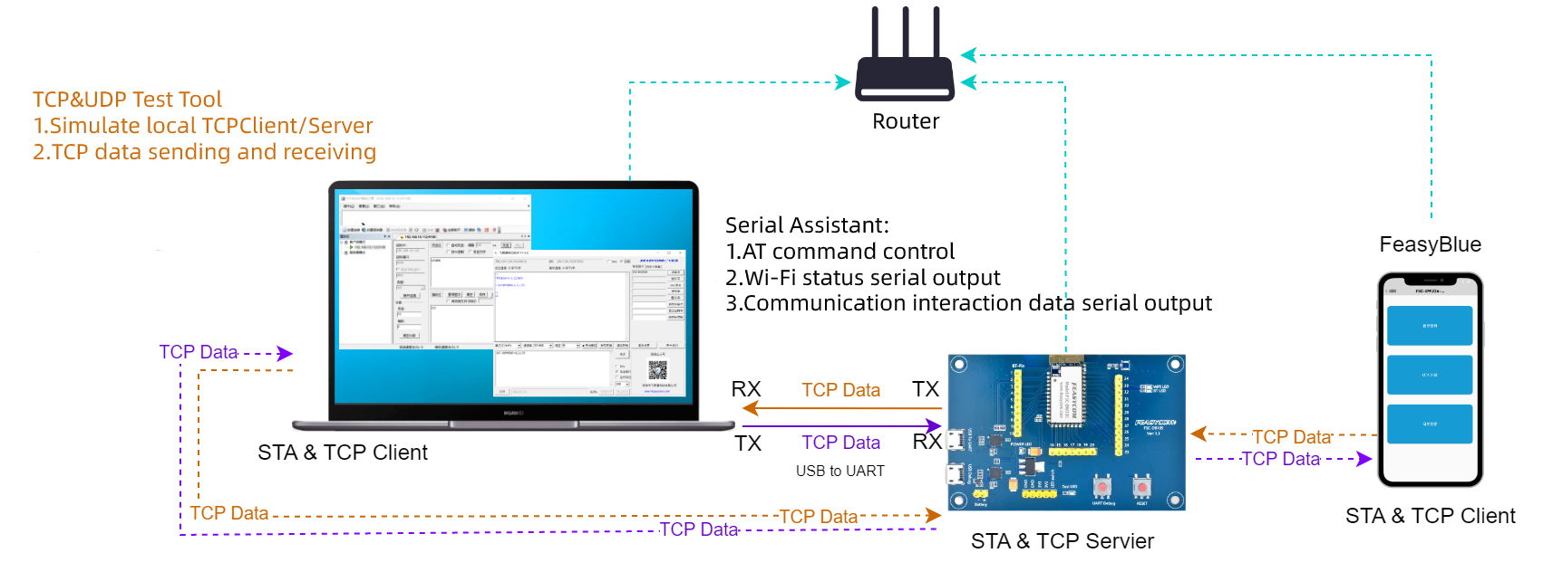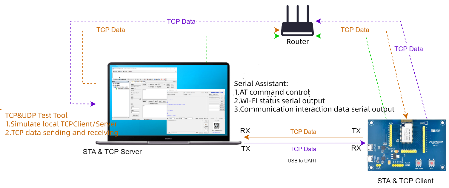 - 4.Connect the PC and the module to the same AP hotspot. Use a third-party network debugging tool on the PC to create a TCP Server.