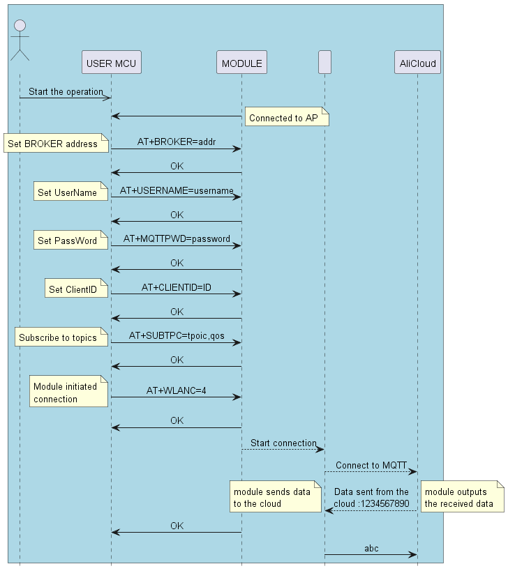 Bluetooth or Wi-Fi connection has been established , The data received through the serial port is still parsed in the AT instruction format, which means data that needs to be sent to the remote end should be carried by AT commands.