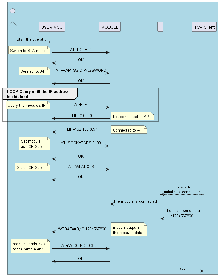 8.The module supports the simultaneous reception of data sent from multiple TCP clients to the TCP Server. The first parameter is the connection ID. In command mode, an example of the AT command operation is as follows:
