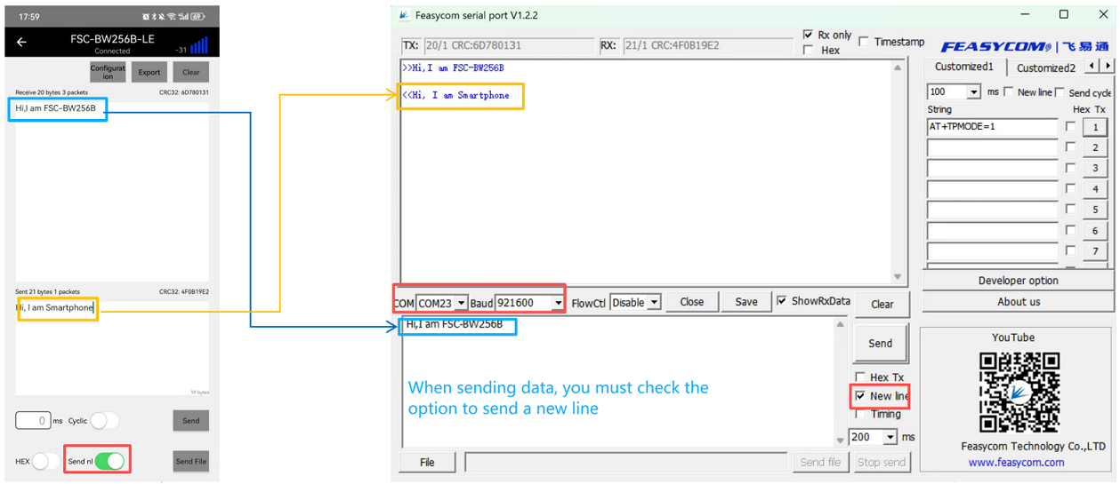 Enter the Throughput Mode: Before establishing Bluetooth or Wi-Fi connection, the FSC-BW256B module can use the command AT+TPMODE=1 to activate the transparent transmission mode.
