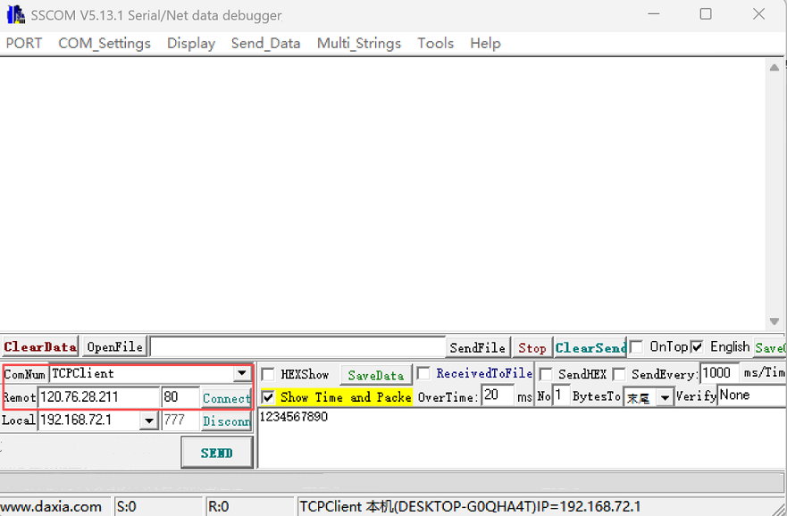 7.After the TCP connection is successfully established, the PC-end network debugging tool will display the successful connection, as well as the data sending area and receiving area. TCP data sending and receiving can be carried out, such as sending data 1234567890 to the remote TCP Client module