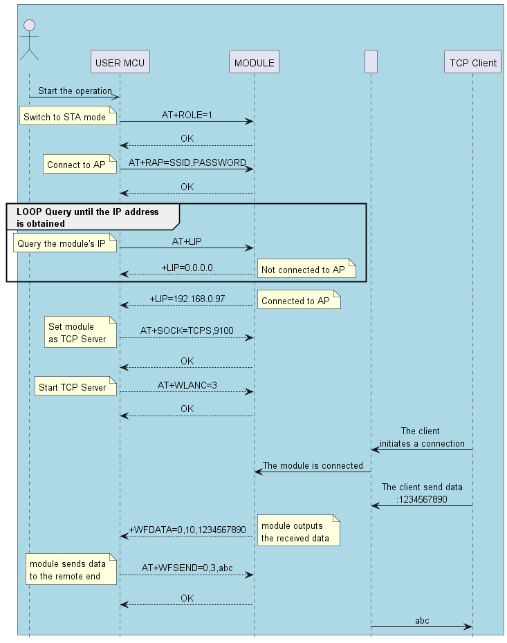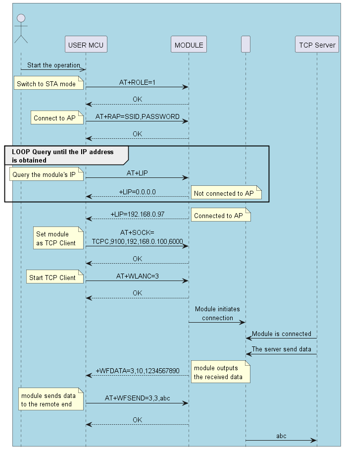 The module acts as a TCP client to initiate the establishment of a TCP connection with the remote TCP Server. An example of the AT command operation is as follows: