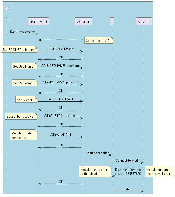 The data format for sending and receiving mentioned above differs from that of AT commands. Standard AT commands end with <CR><LF> , while the above-mentioned control commands are strings that do not come with <CR><LF>.