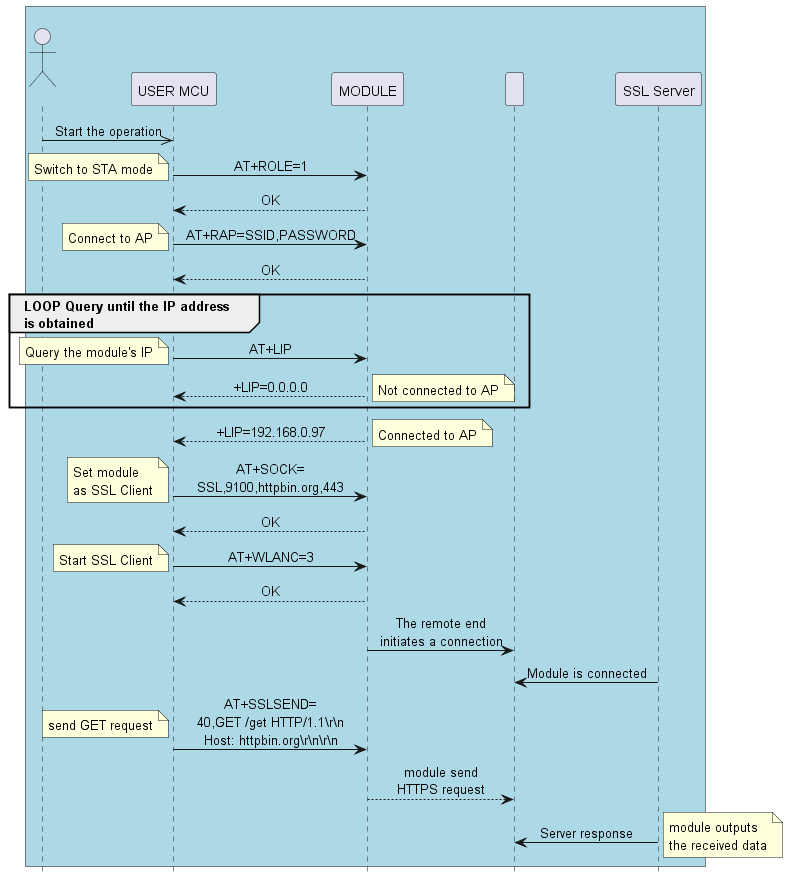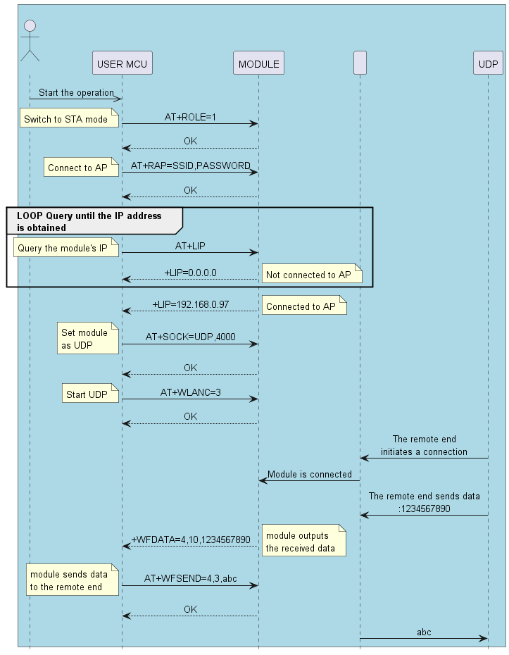 Connect the module to the AP hotspot. The AT command operation example is as follows: