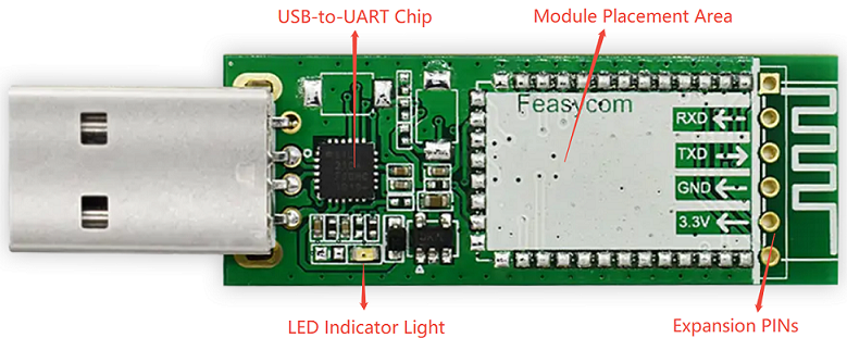 FSC-DB005 development board is compatible with a variety of Bluetooth modules adopting the 13mm×26.9mm stamp-type 36-pin package, such as the FSC-BT826x Series, FSC-BT836x Series, FSC-BT910x Series, and FSC-BT909C. Compared with these Bluetooth modules, the FSC-DB005 provides users with a more convenient and user-friendly product testing experience. It is equipped with a USB interface for direct connection to a computer, which not only saves time but also ensures stability during testing. This USB development kit supports communication via the SPP, GATT, and HID profiles, further enhancing its flexibility in adapting to diverse application requirements.
