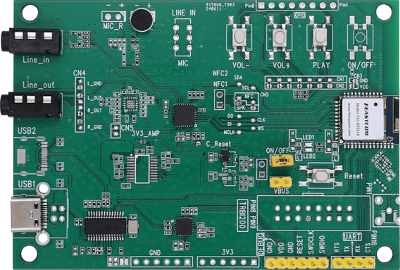 EVB DB2(FSC-DB215-BT631D):Receive the BIS broadcast audio stream from the DB1 side (BIS Gateway), and simultaneously output the audio stream to the external audio device through the development board’s LineOut component—meaning the external audio device can synchronously play the audio stream from the mobile phone side.