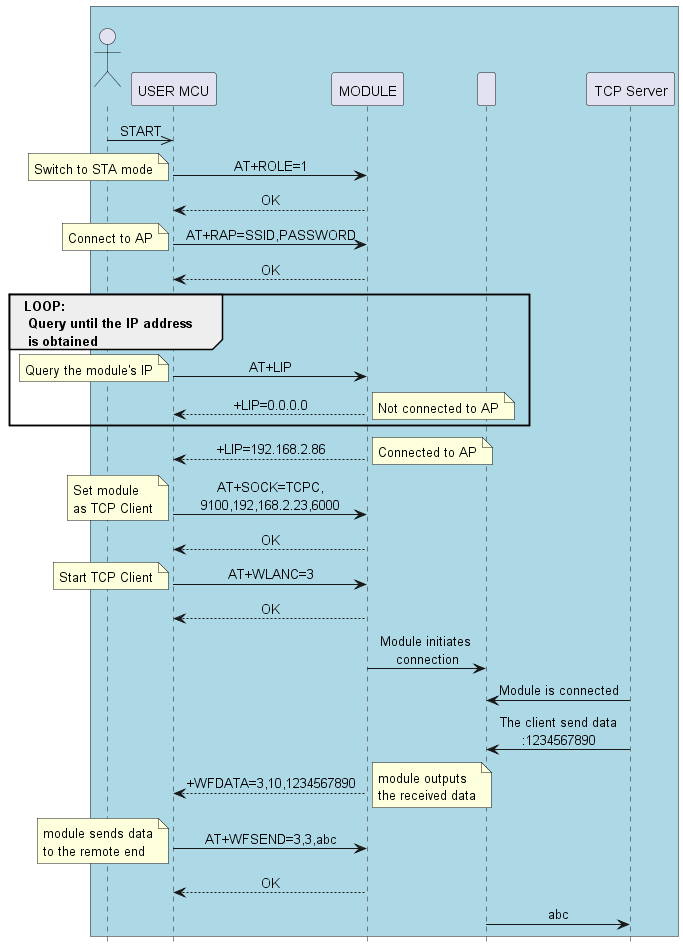 Note: To use transparent data transmission, send AT+TPMODE=1 before setting the Wi-Fi mode